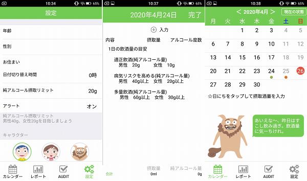 登録者の性別によって飲酒量の目安が異なるほか、平均飲酒量の設定が自分で行えるようになっています。