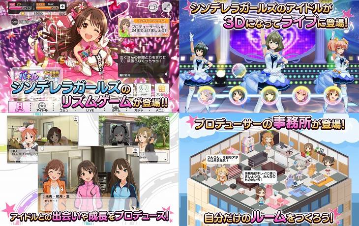 自分だけのユニットを編成できるほか、ライブシーンではシンデレラガールズが3Dで登場。初期の収録曲は20曲以上、美少女アイドルは50人以上が登場します。