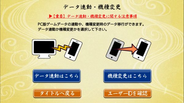 - タイトルメニューから『PC連動・機種変更』をタップ